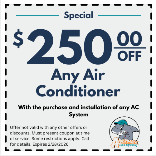 Don’t wait to upgrade your home’s comfort and efficiency! Explore our exclusive coupons and specials designed to keep your plumbing and HVAC systems running smoothly—all while saving you money. Claim your deal today and let Affordable Air & Plumbing take care of the rest!